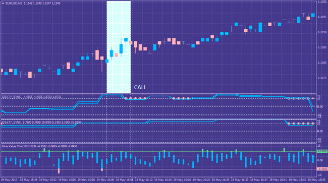 NYC works on a minute timeframe. Here we will look for the most profitable entry point. In other words, DSATY SYNC shows the main trend, and NYC determines the correction. An option is purchased on the next bar, a cut after the previous one closes in red.