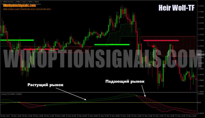 The Heir Wolf TF strategy for binary options contains two indicators, one of which is a signal indicator and marks entry points into a trade on the chart in the form of arrows, and the second indicator for binary options helps filter signals thanks to a “cloud” reminiscent of the Ichimoku Kinko Hyo indicator . and local support and resistance levels .
